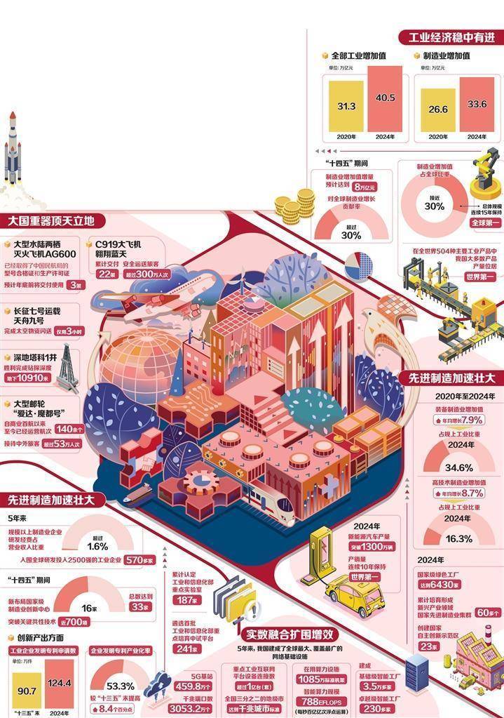 实体经济是一国经济的立身之本。“十四五”期间,我国大力推进新型工业化,不断巩固壮大实体经济根基,取得了瞩目成绩。制造业总体规模连续15年保持全球第一,全部工业增加值从31.3万亿元增长到40.5万亿元,制造业增加值从26.6万亿元增长到33.6万亿元……一组组数据,彰显出中国经济的坚实底气和强大韧性。